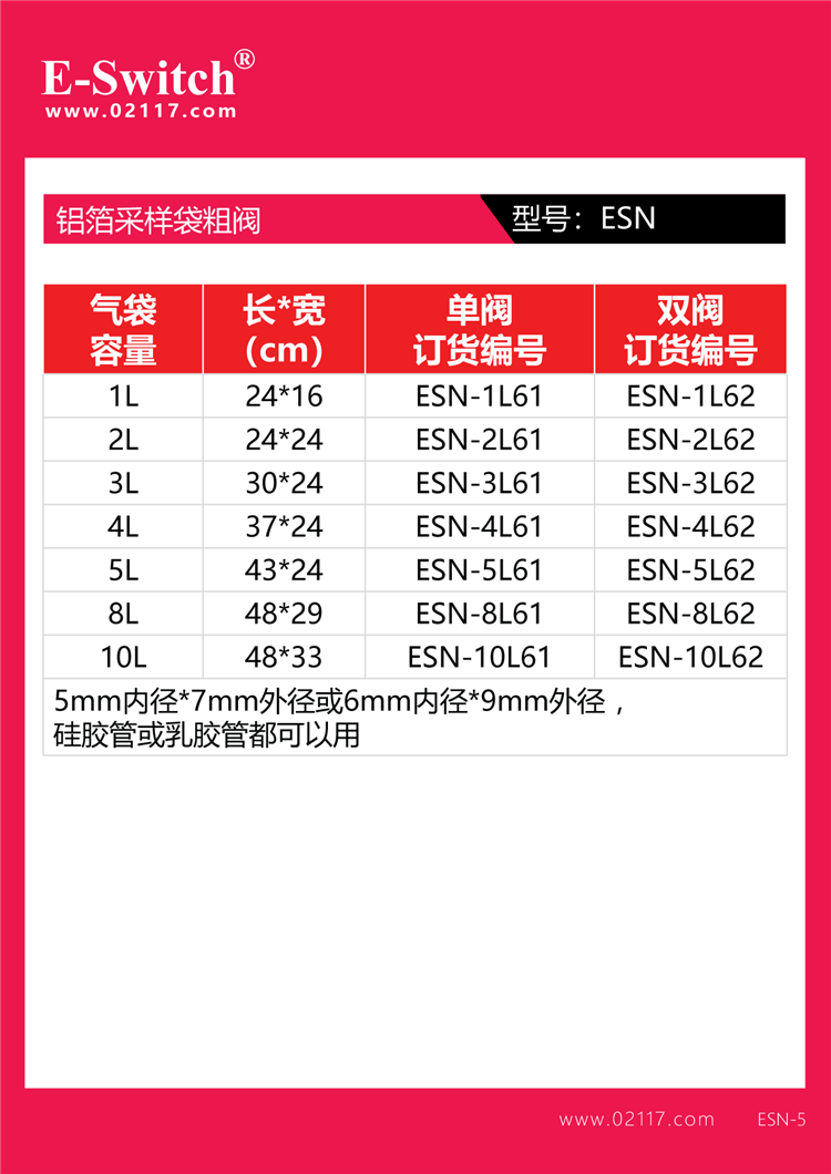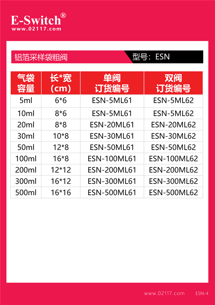 E-SWITCH品牌铝箔气体采样袋容量参考尺寸表(袋子尺寸在每批发货时,可能尺寸有部分变动,以实际发货尺寸为准):