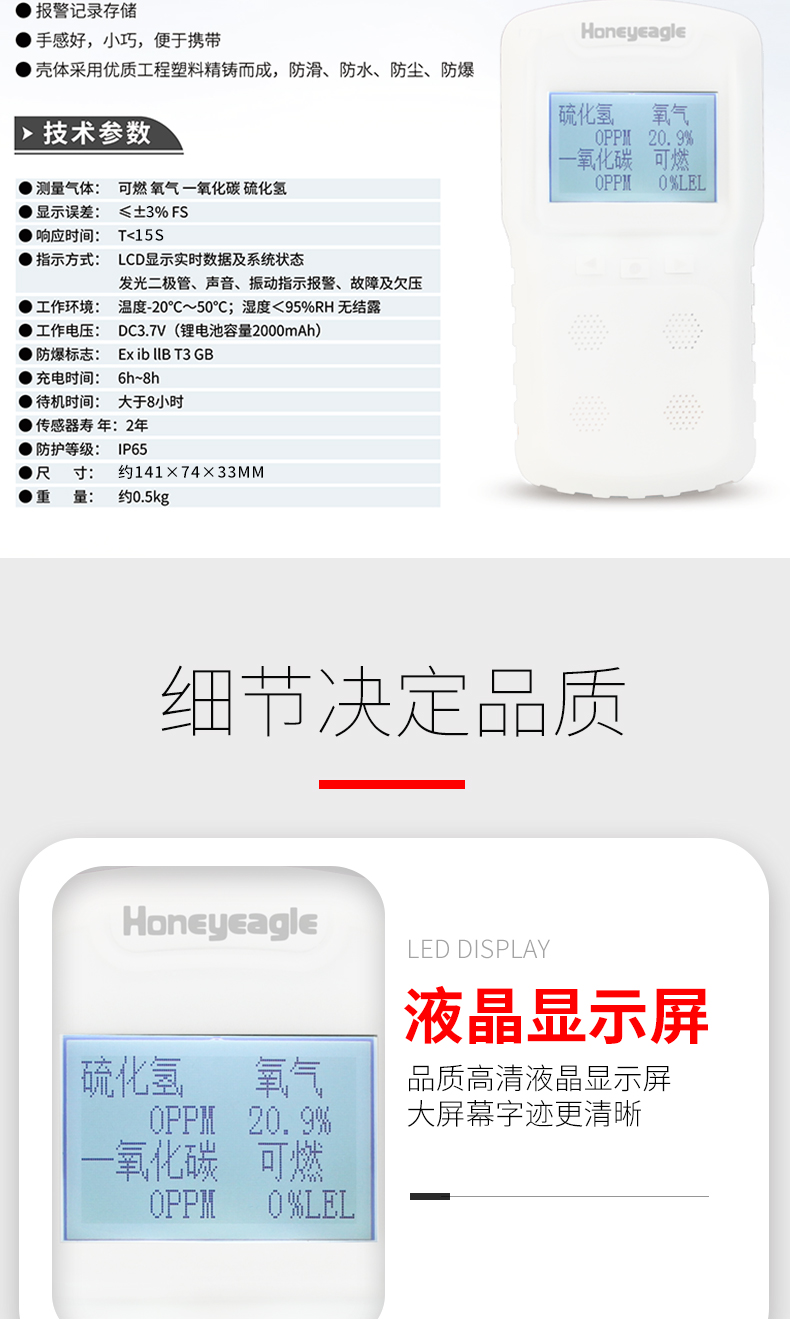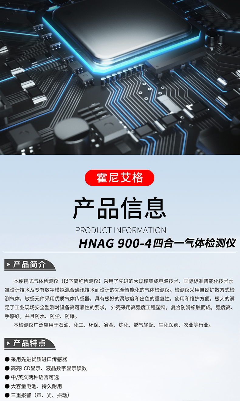 霍尼艾格便携式四合一气体检测仪 可燃气体氧气一氧化碳硫化氢探测报警器 型号:HNAG900-4