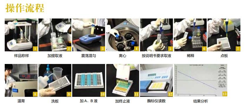 样品称样、加提取液、振荡混匀、离心、按说明书要求取液、稀释、点板、温育、洗板、加A\B液、加终止液、酶标仪读数、结果分析。