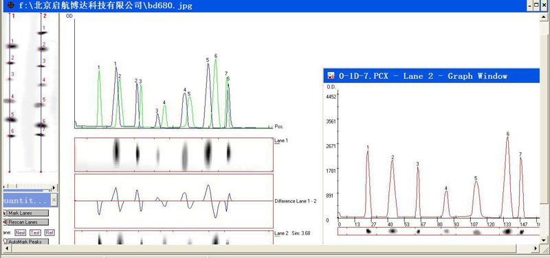 自动识别多条泳道和条带,自动描绘扫描曲线,可修正条带和前部扭曲等功能分子量、浓度计算选择标准的泳道的分子量值,计算未知带分子量和浓度