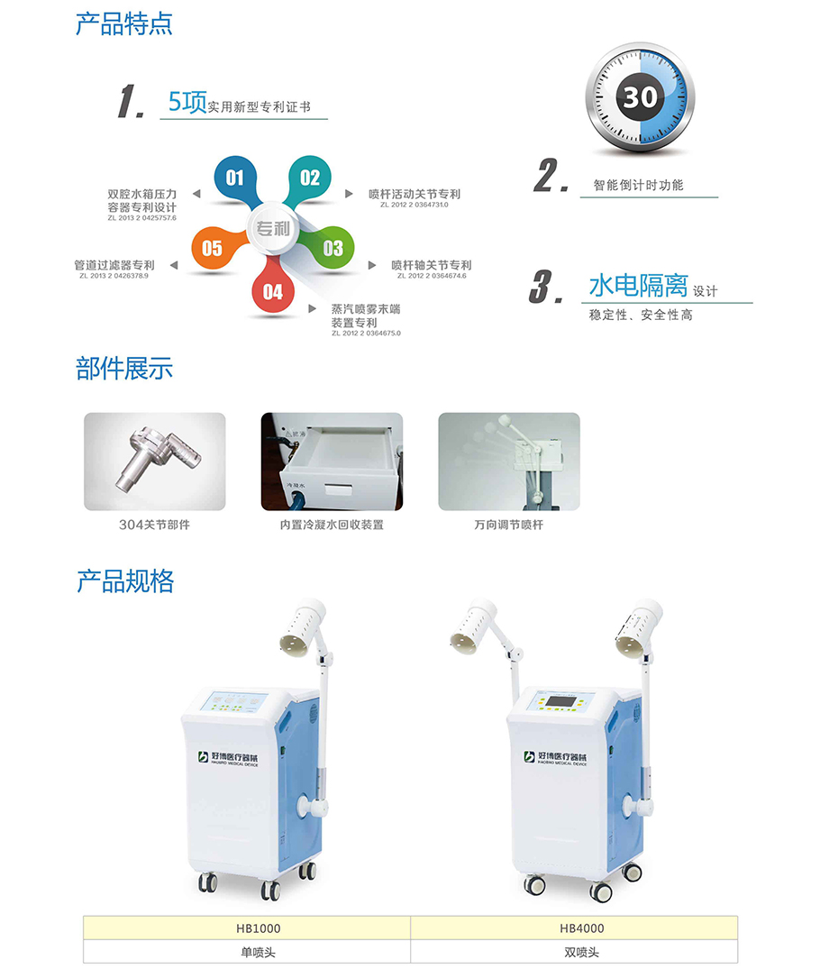 7、喷头采用双腔隔热设计(可提供专利证书),具有主容器和副容器,保证喷汽均匀,不喷水不滴水,治疗更舒适