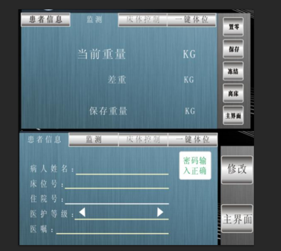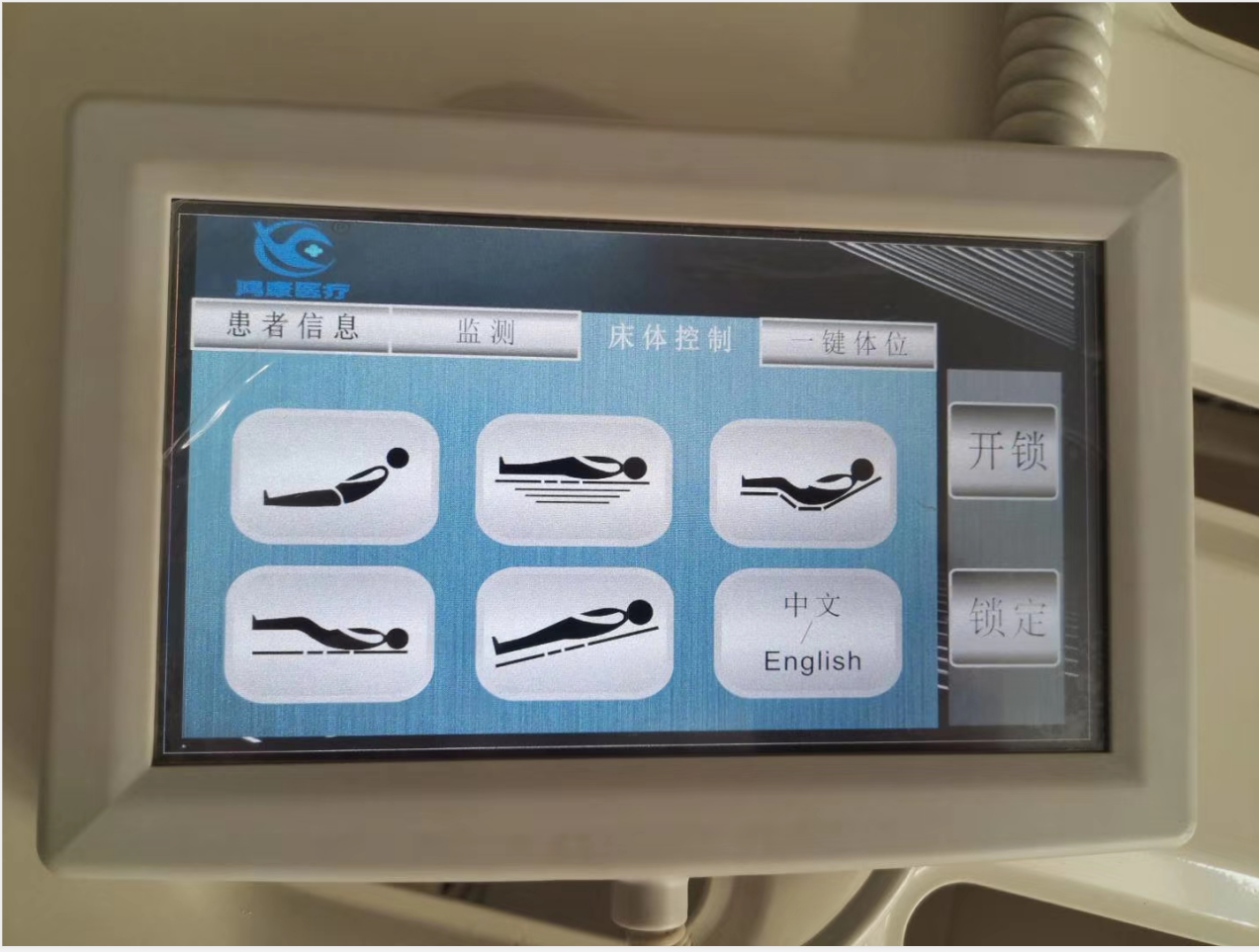 控制系统:通过手控板或触摸屏操作完成医疗床各种功能,有背部升降(上下),腿部曲伸