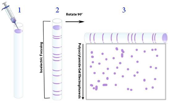 DE是蛋白质组学研究中最早应用的技术。迄今为止,它仍是蛋白质组学研究中常用的分离手段。蛋白质组学研究的核心在于确保分离出的蛋白质具有高分辨率和可重复性,2-DE凭借它在分离上千蛋白质的同时,还能通过显色技术对差异表达蛋白质进行定量分析,被广泛应用于蛋白质组学研究中。它的主要步骤包括:蛋白质样品制备、等电聚焦(IEF)、SDS-PAGE、染色等。