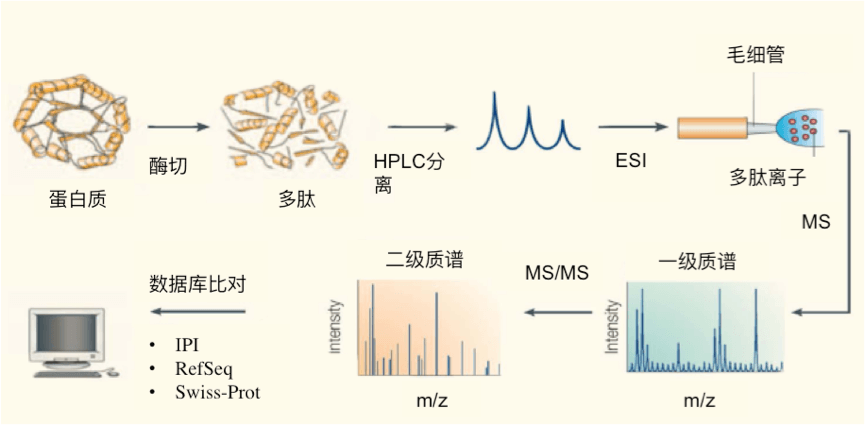 在整个蛋白质组学研究中,准确鉴定分离蛋白是最关键的步骤。质谱鉴定技术具有高灵敏度、高通量、高时效性等特点,在蛋白质组学研究中一直扮演着重要的角色。传统的质谱技术只能用于小分子量物质的分析,但随着科技的进步质谱技术也得到了长足发展,能对更加复杂的物质进行检测同时自动化程度和精确度更高。常见蛋白质质谱鉴定技术有:基质辅助激光解析电离飞行质谱(MALDI-TOF-MS)、电喷雾质谱(ESI-MS)、蛋白指纹谱鉴定(PMF)、串联质谱法(MS/MS)、液相色谱联用质谱(LC-MS)等。