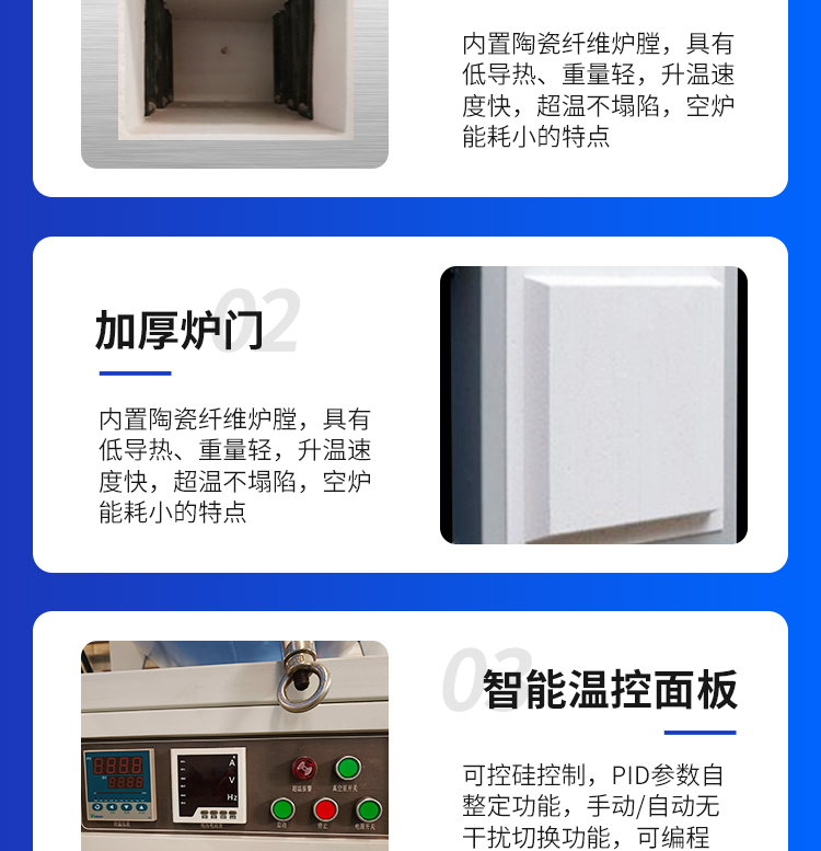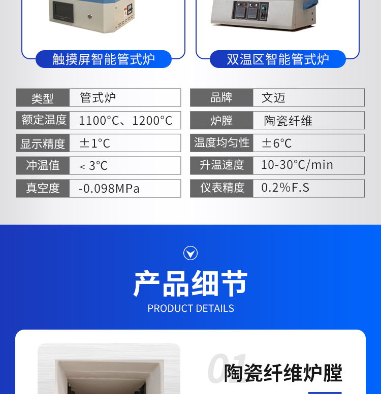 可选配开门自动断电功能,具有超温报警功能,具有内置参数密码控制功能。真空气氛型选用不锈钢密封套件和优质刚玉管,密封效果好,真空度-0. 098MPa.升温速度为0-30℃/分钟,升温速度快,空炉能耗小,节能50%以上。·控温精度高,显示精度±1℃;冲温值小于3℃,温度均匀性±6℃.1300℃和1400℃的管式炉选用硅碳棒加热和99刚玉管。多种安全防护设计,安全性能好,使用寿命长。