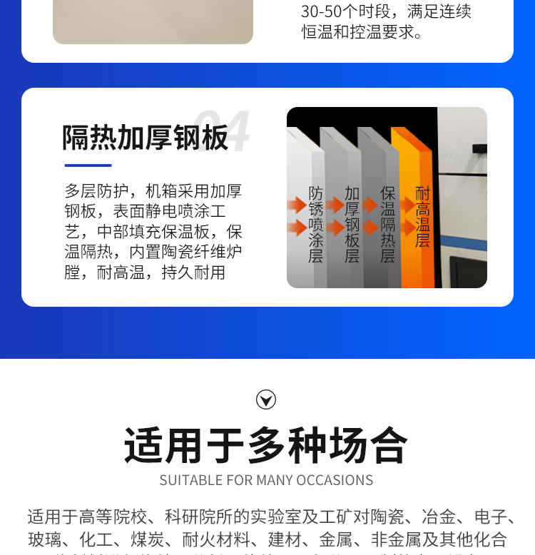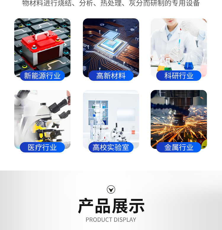 主营产品有:人工智能箱式电阻炉(马弗炉)、高温箱式电阻炉(马弗炉)、超高温箱式电阻炉、可控气氛箱式电阻炉、可控气氛管式电阻炉、ZrB2复合陶瓷发热体(直型/U型)、ZrB2复合陶瓷热电偶、可控气氛超高温箱式电阻炉、超高温真空烧结炉、超高温感应加热炉、真空气氛热压炉、抗热震试验炉、工业箱式电阻炉、钟罩炉、升降炉、高温气压反应烧结炉、氮化梭式电加热炉等。