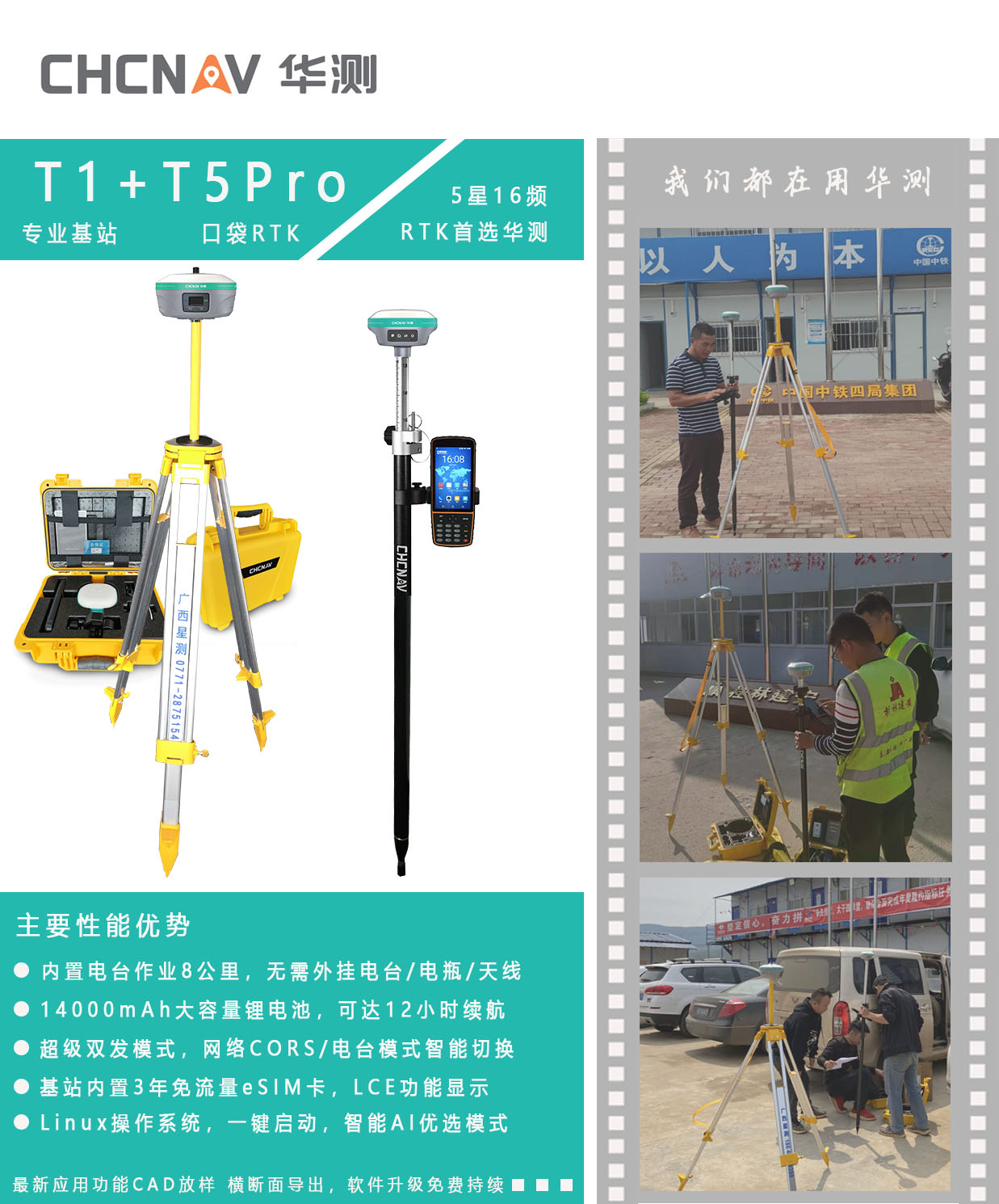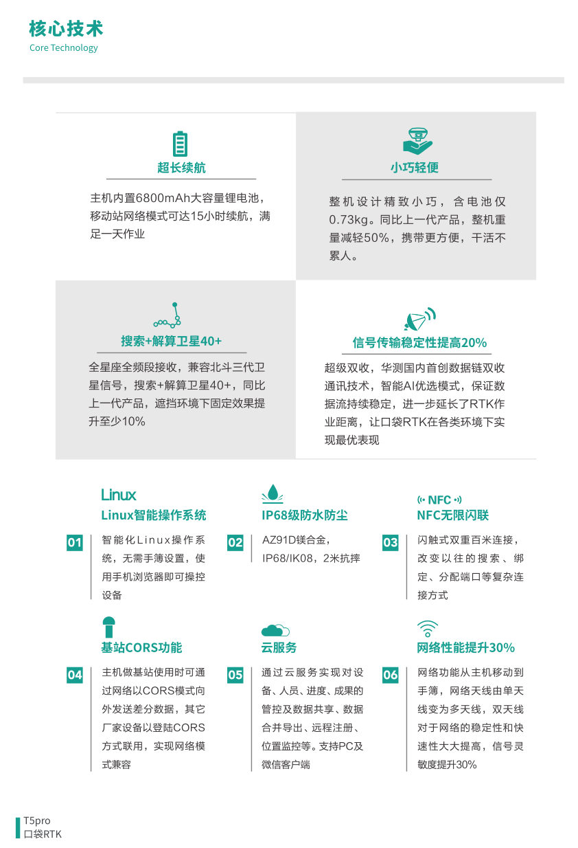 T5 Pro口袋RTK,整机设计小巧轻便,携带方便干活不累人;全星座全频段接收,兼容北斗三代卫星信号,进一步增强仪器的扛遮挡能力;华测独创的超级双收模式,一键启动,一如既往的强劲续航,满足整天作业。