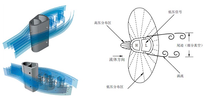 当流体流过威力巴探头时,在其前部(迎流方向)产生一个高压分布区,高压分布区的压力略高于管道的静压。根据伯努利方程原理,流体流过威力巴探头时速度加快,在威力巴探头后部产生一个低压分布区,低压分布区的压力略低于管道的静压。流体从探头流过后在威力巴探头后部产生部分真空,并且在威力巴探头的两侧出现漩涡。
