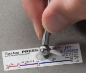 Firmly compress replica film using the rounded end of the included stainless steel burnishing tool. Apply sufficient pressure in a circular and x-y rubbing motion to produce a replica with a uniform pebble grain appearance. It normally takes 30 to 60 seconds to fully compress all parts of the film on most surfaces. In general, too much compression is safer than too little.