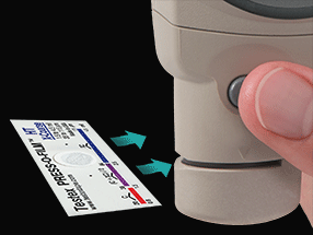 Clean the measurement surfaces (anvils) using the included cleaning card. Swipe the card through the opening a few times while firmly pressing both probe buttons to remove dust particles and residual tape adhesive.