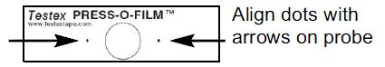 To position the tape, move the Testex? Press-O-Film? replica tape to the back of the probe and align the two dots (printed on replica tape) with arrows on both sides of the measurement opening.