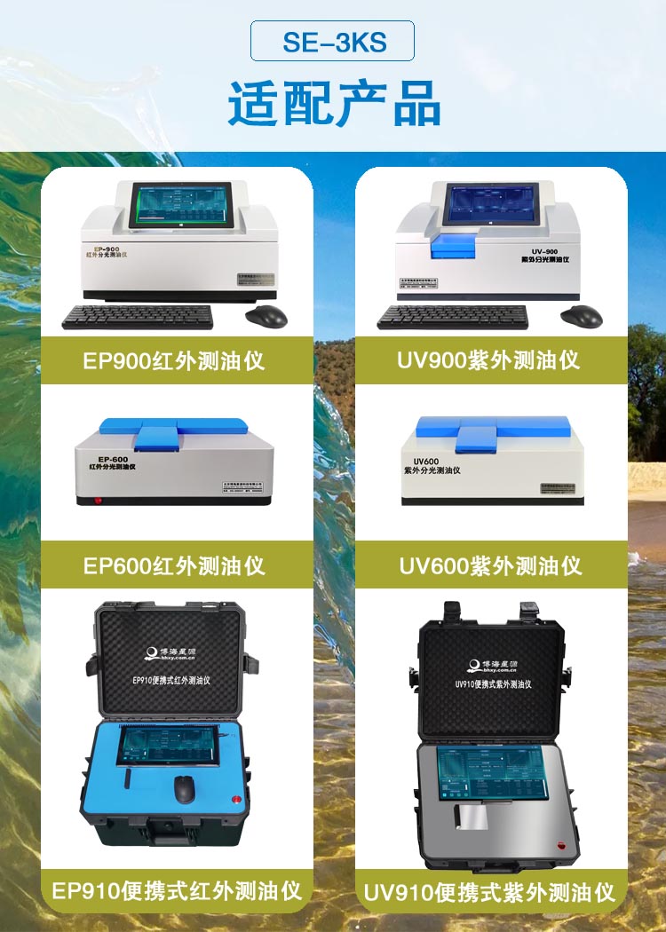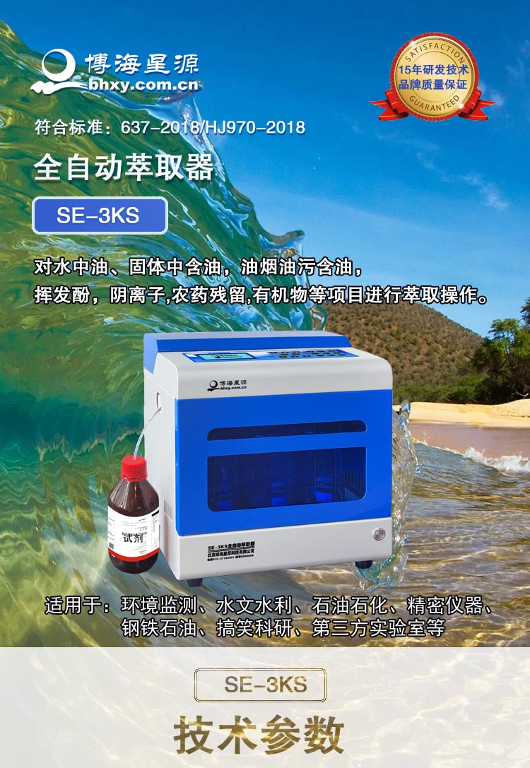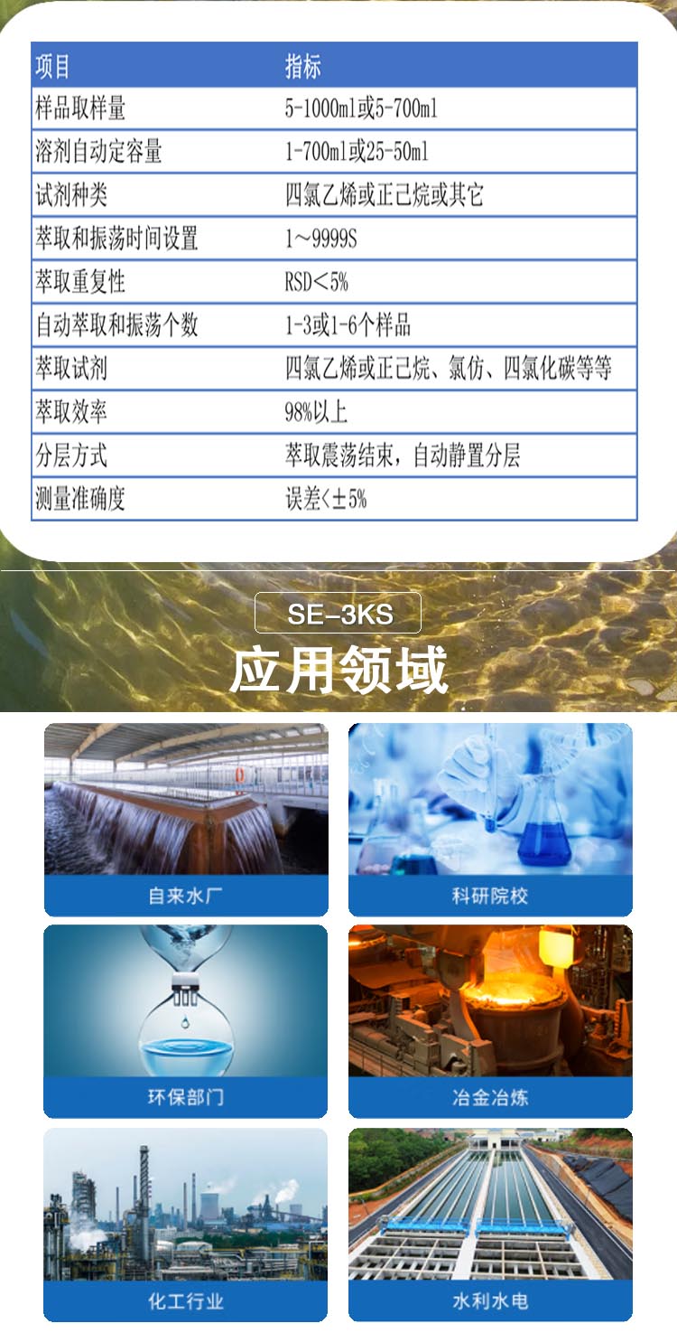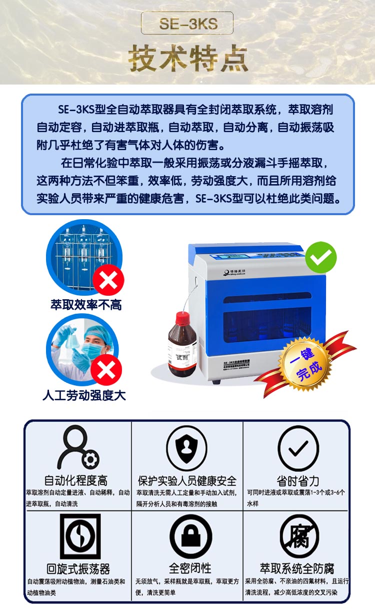 1. 全自动萃取器测油用SE3KS一键完成:3或6个水样,全自动定量进溶剂、自动萃取、自动分离、自动除水、自动吸附动植物油,接出溶液测量即 可;