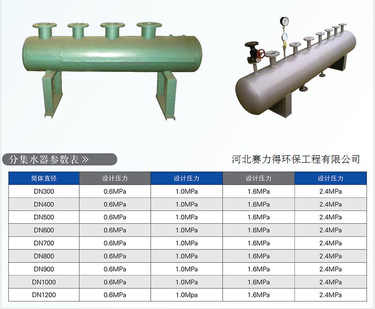 分集水器是将多路进水通过一个容器一路输出的设备。其管理若干的支路管道,分别包括回水支路和供水支路,其较大多为DN350-DN1500不等,用碳钢或不锈钢板制作,属于非标压力容器类专业制造,其需要安装压力表温度计。它一方面将主干道的水按需要进行流量分配,保证各区域分支环路的流量满足负荷需要,同时还要将各分支回路的水流汇集,并且输入回水主干管中,实现循环运行。其回水再利用,可达到更节能的效果,可以同时满足供热与制冷的需要,其广泛应用于锅炉、中央空调、工业循环冷却水系统、热水系统。可按照客户需求定制各种分、集水器。