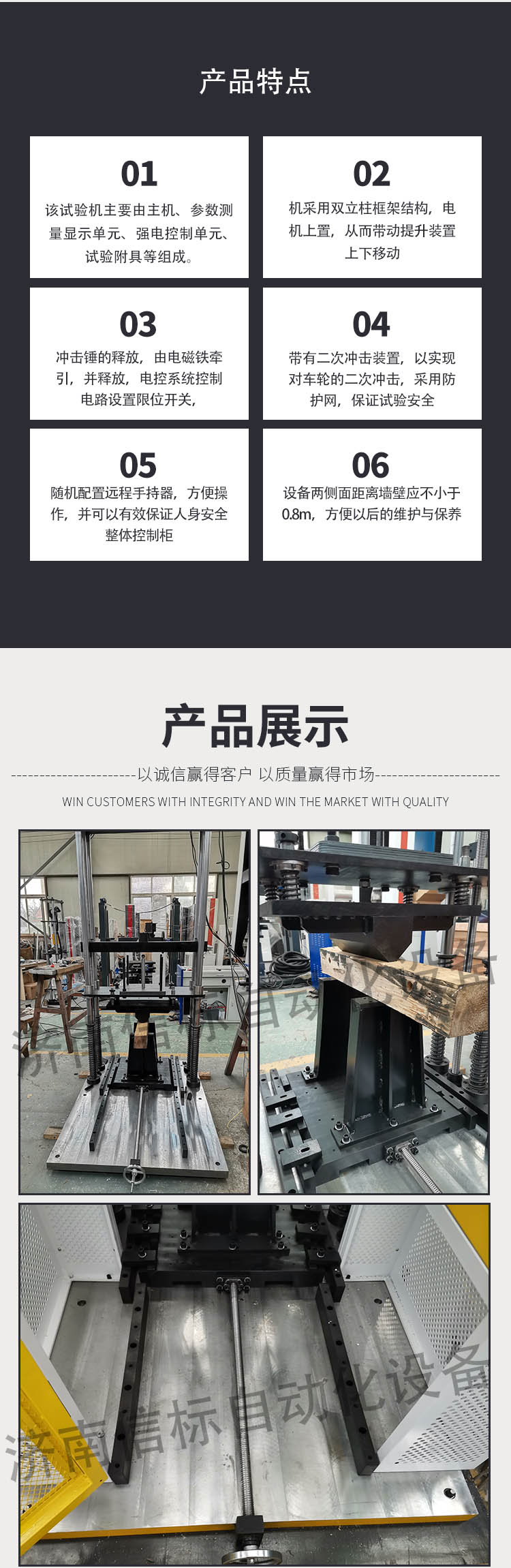 该试验机用于模拟车辆行驶过程中经过沟坑等起伏路面时轮毂受到的冲击力,该试验机冲击能量可调(通过调整砝码配重和冲击高度实现),系统配置调整高度的丝杠和伺服电机控制高度的变化,高精度编码器实时显示冲击高度,(实验前输入轮毂直径和冲击高度后,系统自动调整到预设位置,)专用电磁脱扣机构,稳定可靠,系统配置双重保险装置,防止误操作造成冲击。(防护门不关无法进行试验,不解除保险销无法进行试验)。