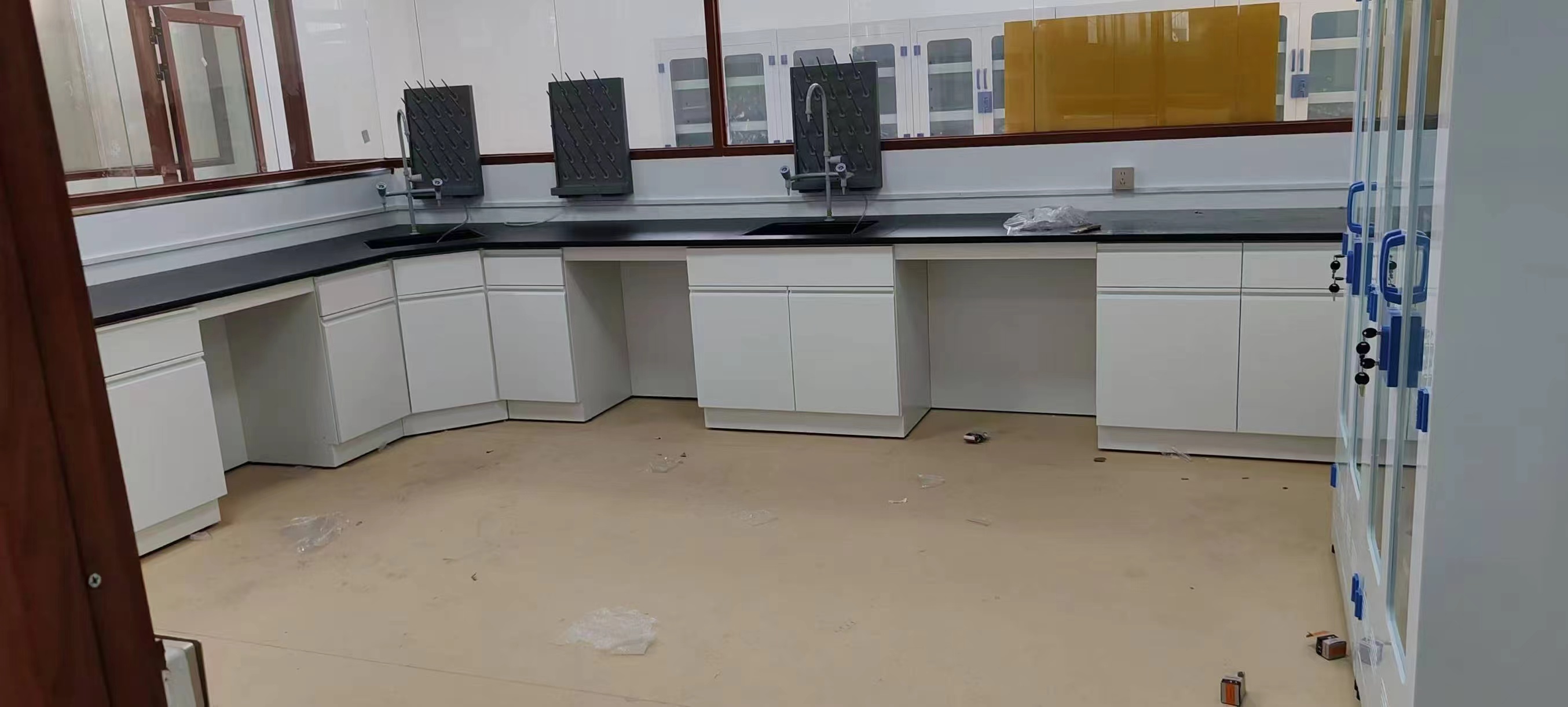 规格多,组合灵活,根据房间大小,可以任意组合成需要的实验台(边台或中央台),亦可选配吊柜,柜体从300主机柜到1000双门双抽柜,每隔25MM就有一个单元柜,还配有带抽屉坐位、带键盘架坐位和空坐位,
